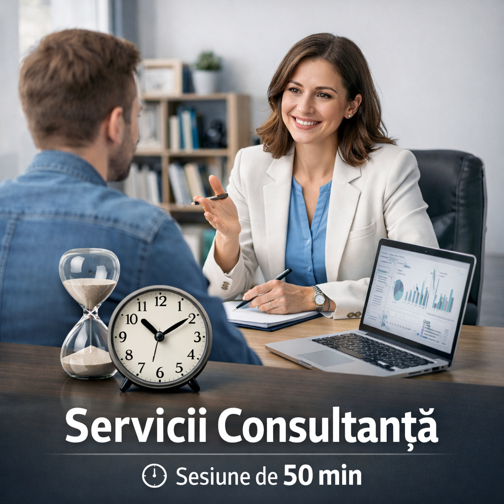 Beneficiază de o sesiune de consultanță dedicată, cu durata de 50 de minute, adaptată nevoilor tale specifice. Analizăm situația actuală, identificăm soluții concrete și stabilim pași clari pentru atingerea obiectivelor tale.